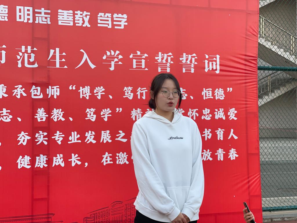 随后2023级小学教育一班张宇彤代表新生以《青春与使命同行》为主题