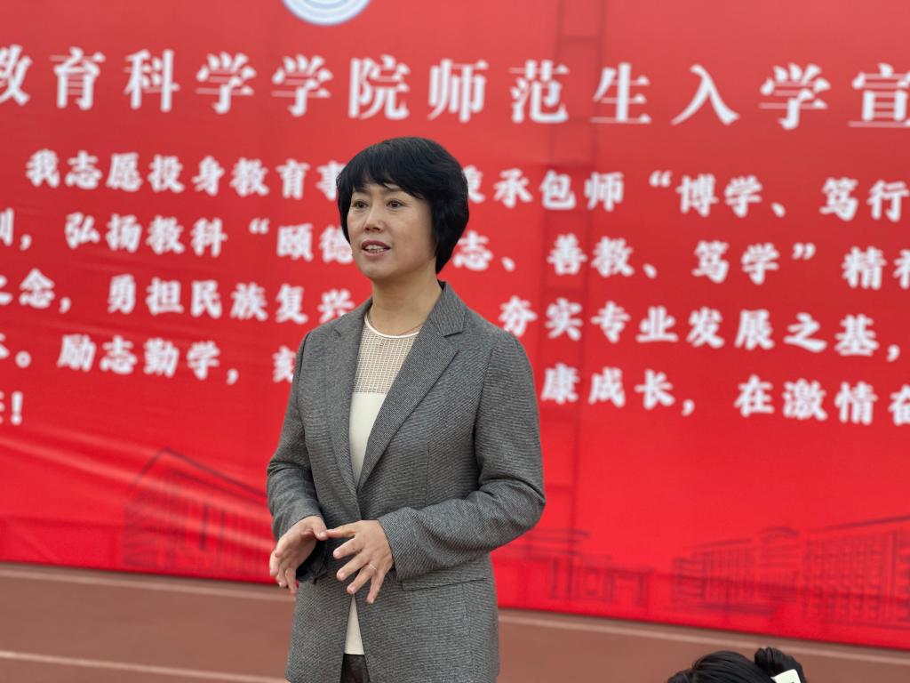 最后,刘俊英副院长做了动员讲话。她讲到,入学宣誓,不仅是师范生的一次专业教育活动,更是师范生的角色与身份认同活动,表明我们对教师之道、教育之道、师范之道的理解与尊重,它是师范生专业思想教育的重要一课。刘院长勉励同学们要践行“学高为师、身正为范”的德操和风范,大学时期是扣好教师职业生涯第一粒扣子的关键时期,师范生作为明日之师,要打牢学习基础,涵养道德品质,永葆奋斗进取的青春本色。