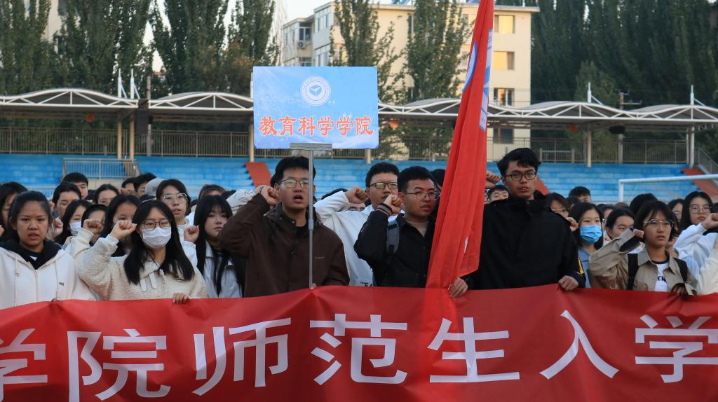活动共有四项议程。伴随着清晨的阳光,入学宣誓仪式在庄严的国歌声中拉开序幕。在王敏教授的带领下,全体师生在国旗下举起右拳,庄严宣誓:“我志愿投身教育事业,秉承包师“博学、笃行、齐志、恒德”校训,弘扬教科“颐德、明志、善教、笃学”精神。常怀忠诚爱国之念,勇担民族复兴之责,夯实专业发展之基,坚守教书育人之本。励志勤学,刻苦磨炼,健康成长,在激情奋斗中绽放青春光芒!”字正腔圆的宣读,厚积薄发的力量,澎湃激昂的情感充分调动起学生热情,激发出学生对师范生角色的认同和对教师职业的敬畏。誓词提醒同学们,身为新时代师范生,要在大学生活中培养自强精神,践行校训、院训内容,真正做到知行合一、以行证言。