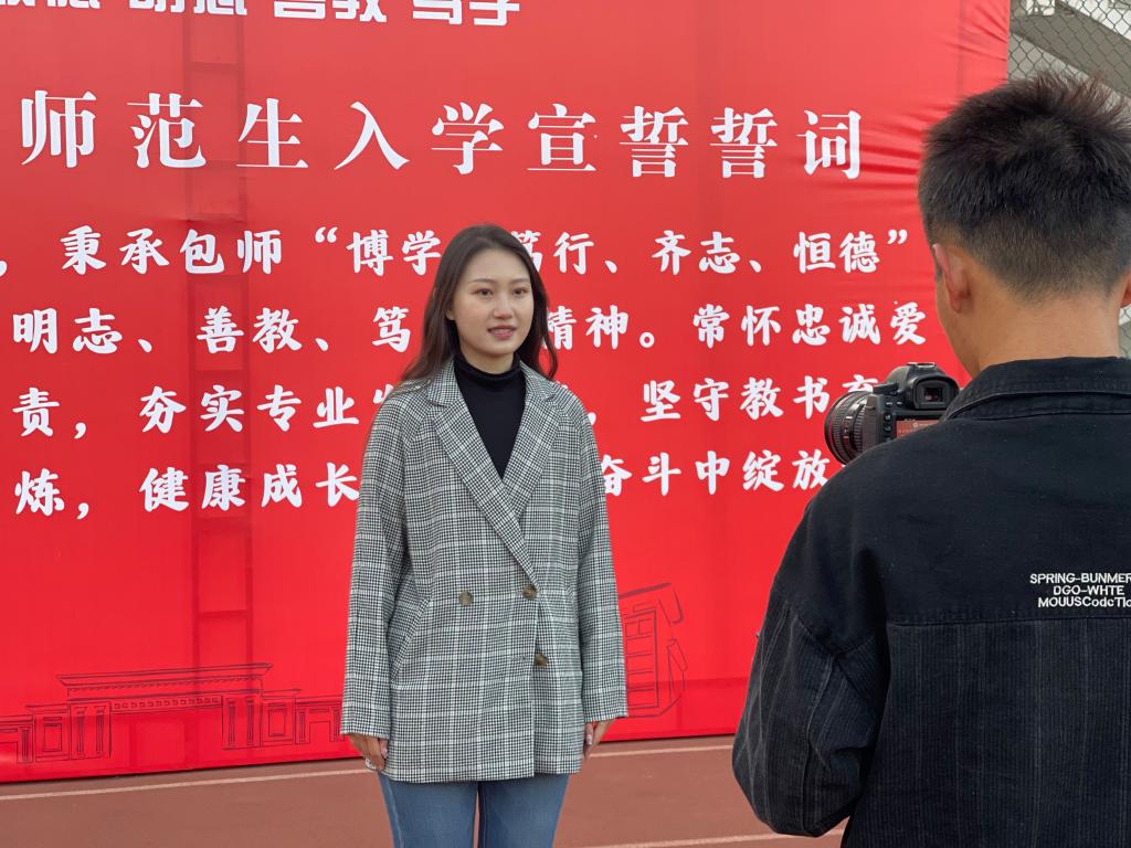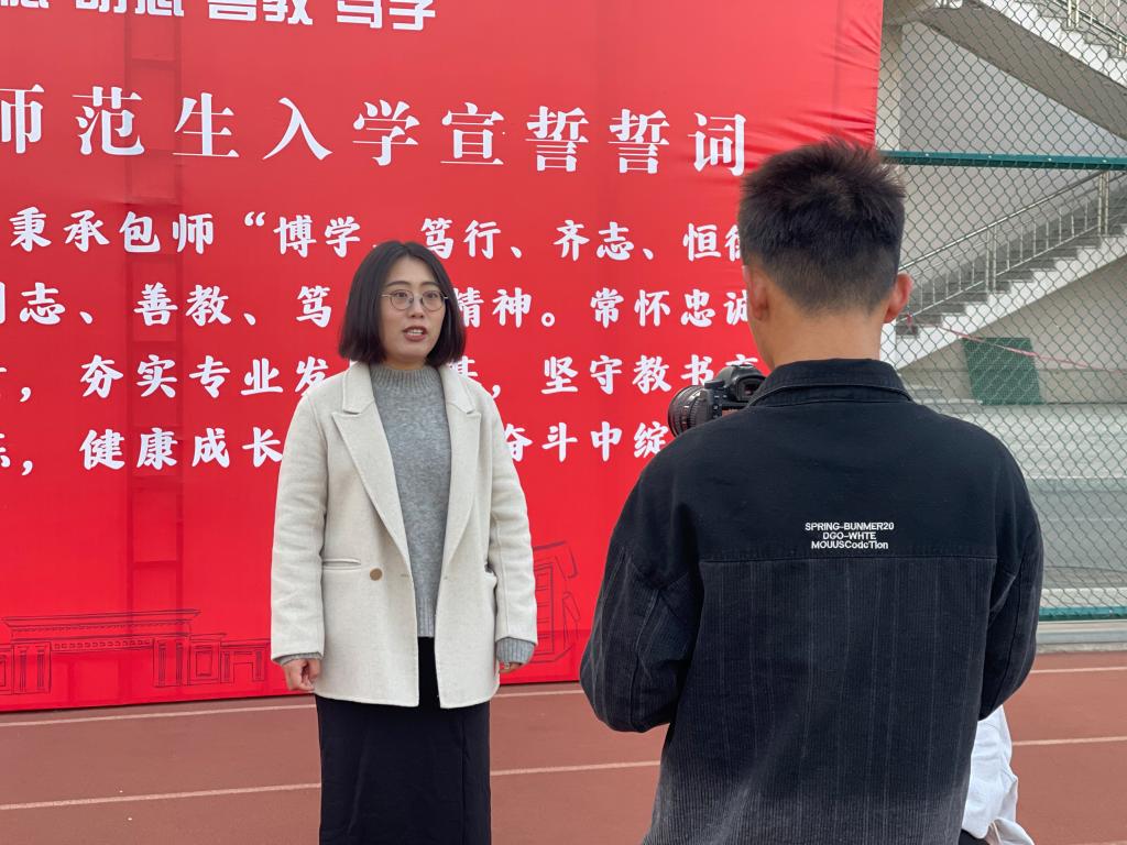 宣誓仪式结束后,小学教育专业任课教师王敏教授、23级学前教育专硕石研宇、23学前二班班主任赵学飞、22级应用心理班苏麟惠、23学前教育二班张伊童接受了学校党委宣传部大学生通讯社的采访,他们均表示,此次举行师范生入学宣誓仪式意义非凡,坚定了同学们的职业信念,激发了同学们的主人翁意识和责任意识,彰显了学院的师范特色,同学们将带着对未来的憧憬和期待,充分利用学校的学习资源和学院提供的平台锻炼自己、展示自己,努力实践、学以致用,做一名合格的包师人、奋进的包师人。