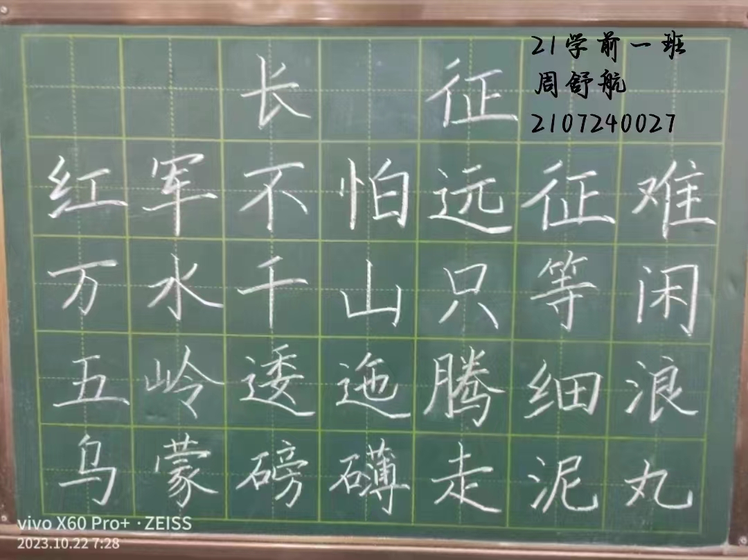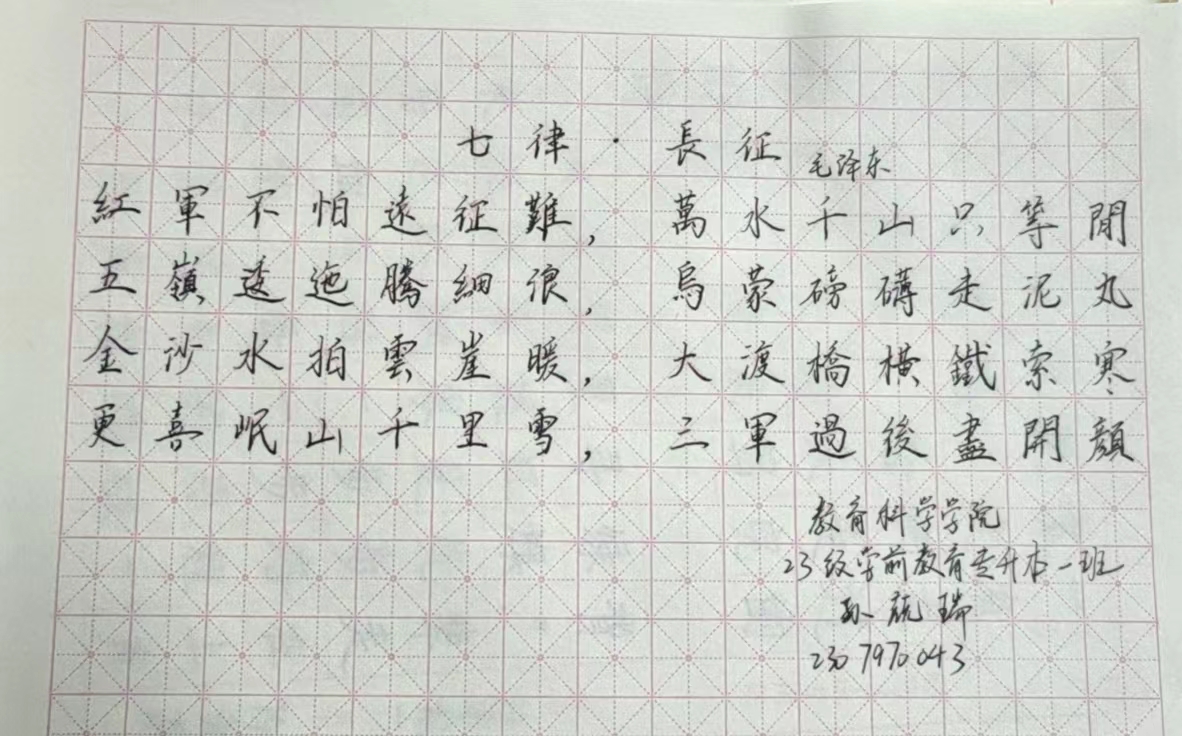 历史照亮未来,征程未有穷期。为纪念红军长征胜利87周年,弘扬伟大的长征精神,激励广大学生牢记历史、缅怀先烈,坚定理想信念,不忘初心、开拓创新,教育科学学院于2023年10月20日举办了“赓续红色血脉,续写时代华章”书法作品征集活动。