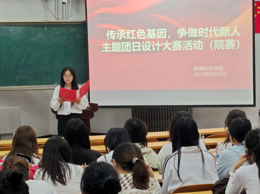 为深入学习贯彻习近平新时代中国特色社会主义思想,引导广大青年学生厚植爱党、爱国、爱社会主义的情感,传承红色血脉,增强团支部的凝聚力与创造力,教育科学学院于2025年9月23日在博东104举办“传承红色基因,争做时代新人”主题团日设计大赛。