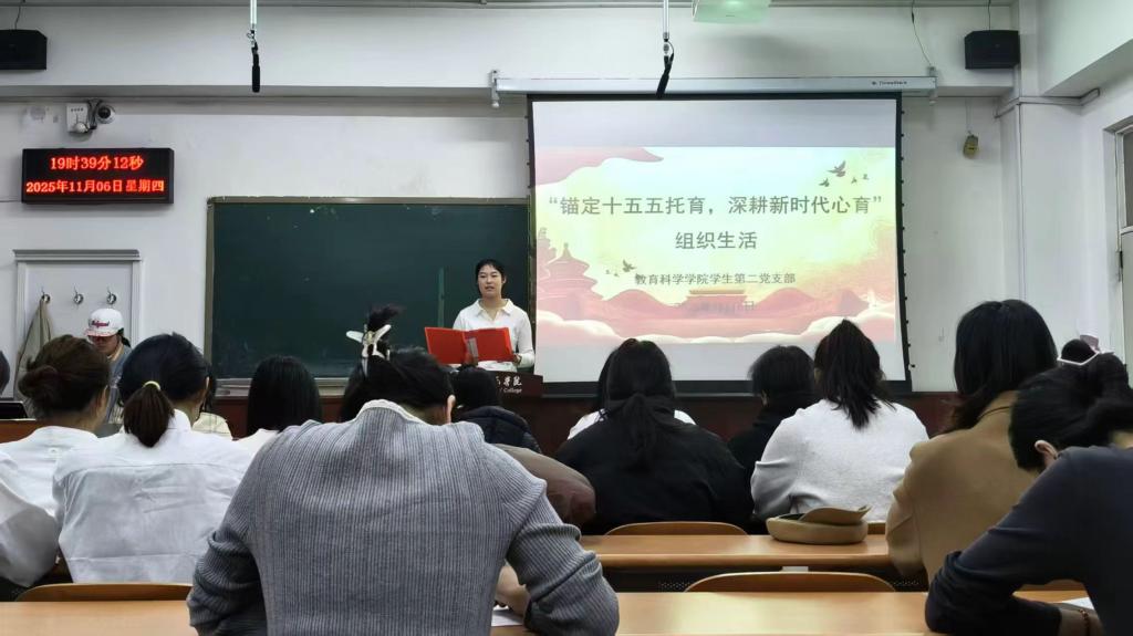 为深入学习贯彻国家 “十五五” 规划战略部署,引导青年党员深刻领会新时代托育与心育工作的时代意义和战略价值,进一步明晰专业岗位的实践路径,教育科学学院学前与心理学生党支部于 2025 年 11 月 6 日在博学楼东 101 室,召开以 “锚定十五五托育,深耕新时代心育” 为主题的组织生活会。本次会议由支部书记梅雅娟主持,23 名党员参会。