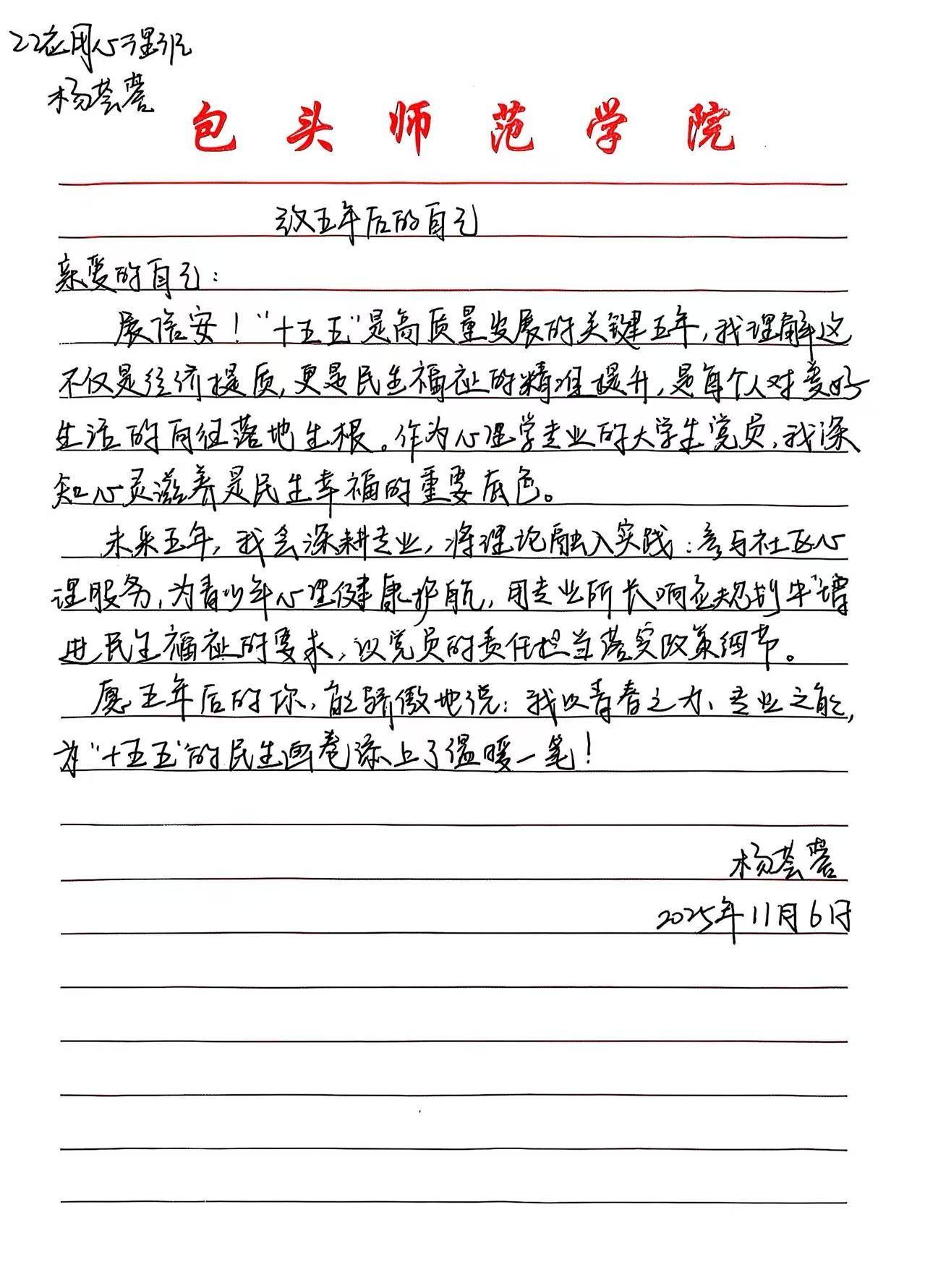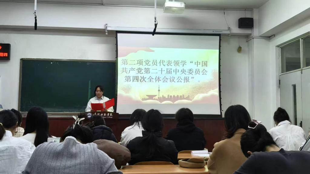 本次组织生活会包括四项议程。议程第一项,支部党员学生代表黄晓彤带领全体党员专题学习《中国共产党第二十届中央委员会第四次全体会议公报》,既系统回顾新时代以来我国发展取得的历史性成就、发生的历史性变革,又逐字逐句解读 “十五五” 时期的历史方位、发展机遇与挑战,清晰阐释了规划的指导思想、基本原则、核心目标及重点任务部署,帮助党员精准把握政策导向。议程第二项,全体党员集体观看“‘十五五’,有哪些关键部署?”专题视频,以直观生动、通俗易懂的形式深化对规划核心要义的理解,增强学习的趣味性与实效性。议程第三项,党员结合“十五五” 规划对托育、心育工作的要求,以书信形式写给“五年后的自己”或“身边的群众”,字里行间饱含对学前教育与心理专业的深刻认知、对行业发展的美好期许,明确了未来深耕专业领域、践行育人使命的路径,以及主动参与政策落地、服务社会需求的具体设想。议程第四项,各党小组围绕书信内容开展热烈研讨,每组选派代表现场朗读书信、分享感悟,在思想碰撞中凝聚奋进共识,形成“互学互鉴、共同提升”的良好氛围。