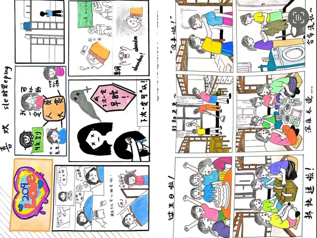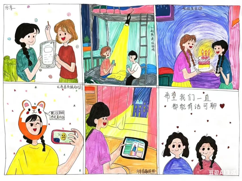 本次活动共收到64份作品。同学们通过漫画、素描等形式,将宿舍趣事、学习点滴等温馨画面凝于笔端。有的作品生动勾勒出宿舍生活的多个温暖瞬间:从一起拆快递的雀跃、为室友庆生的热闹,到打扫卫生的默契、彼此安慰的暖心,每一格画面都将日常相处中的情谊具象化,以真挚笔触定格美好点滴;有的作品以鲜艳明快的色彩呼应主题,画面上方用艺术字体点明主旨,周围点缀彩色气球与彩带,主体部分描绘了室友们围坐谈笑的温馨场景,更搭配深夜宿舍的欢闹画面,将日常相处刻画得鲜活生动,青春气息跃然纸上;有的作品则将宿舍多个生活场景巧妙串联:既有并肩伏案学习的专注模样,也有围坐分享零食的轻松时刻,细腻笔触将互助与陪伴化作生动画面,尽显宿舍的温暖与活力。