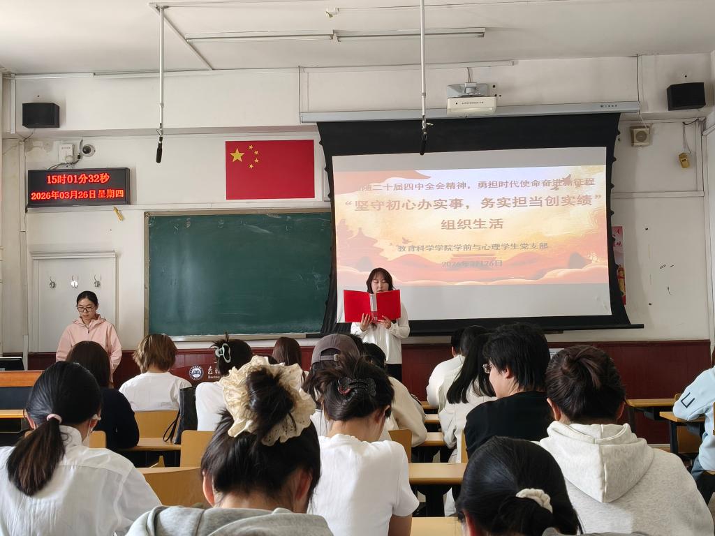为引导学生党员深刻认识正确政绩观的科学内涵与实践要求,牢固树立实干担当的价值导向,切实将初心使命转化为履职尽责的实际行动,教育科学学院学前与心理学生党支部于2026年3月26日15:00在博东201召开了以“坚守初心办实事,务实担当创实绩”为主题的组织活动。本次活动围绕“树立和践行正确政绩观”展开,共包括四项议程。
