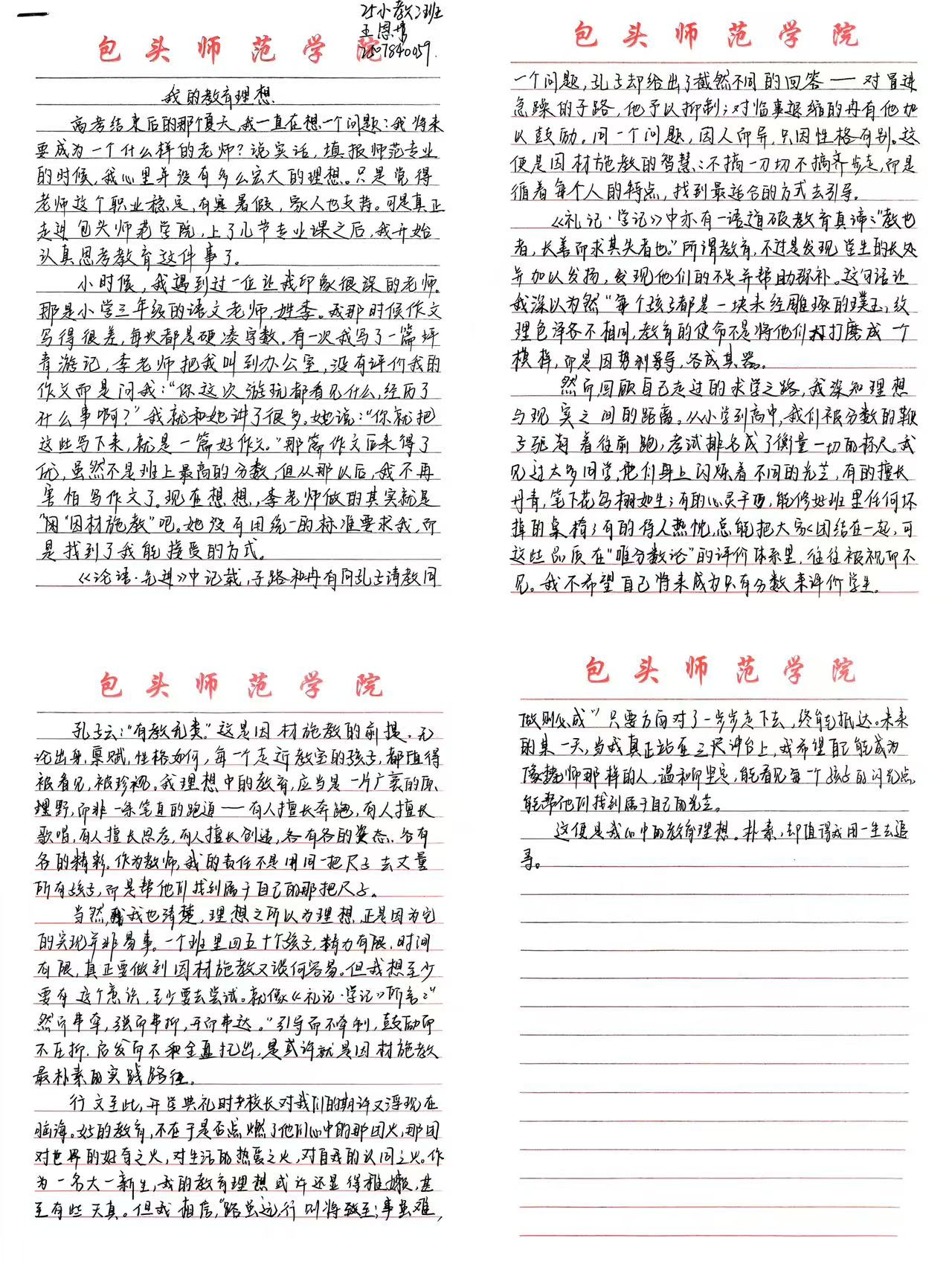 本次活动共收到80份作品。同学们紧扣“我的教育理想”核心主题,以多元文体形式抒发对教育事业的赤诚与思考:有的以议论文为载体,层层剖析教育本质与目的,逻辑缜密地阐述新时代教育的发展方向,字里行间彰显着师范生的理性思考与专业认知;有的以记叙文为脉络,结合自身成长经历或教育见闻,讲述与教育相关的暖心故事,用真挚的情感勾勒出心中理想的教育模样,让教育情怀变得可感可触;还有的以散文为笔触,以灵动的文字描绘对教育实践的美好期许,抒发愿以青春浇灌教育之花的坚定信念,将对教育事业的热爱融入笔墨之间。这些作品从不同视角解读教育理想,既展现了师范生对教育现实的关注,也彰显了青年学子肩负教育使命的青春担当。