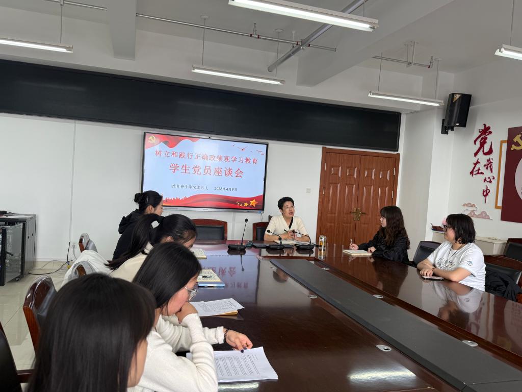 为深入推进树立和践行正确政绩观学习教育,切实倾听学生党员心声,畅通沟通渠道,凝聚育人合力,2026年4月9日,教育科学学院召开学生党员座谈会,学院党总支书记李燕主持会议,各支部书记、全体学生党员参加会议。