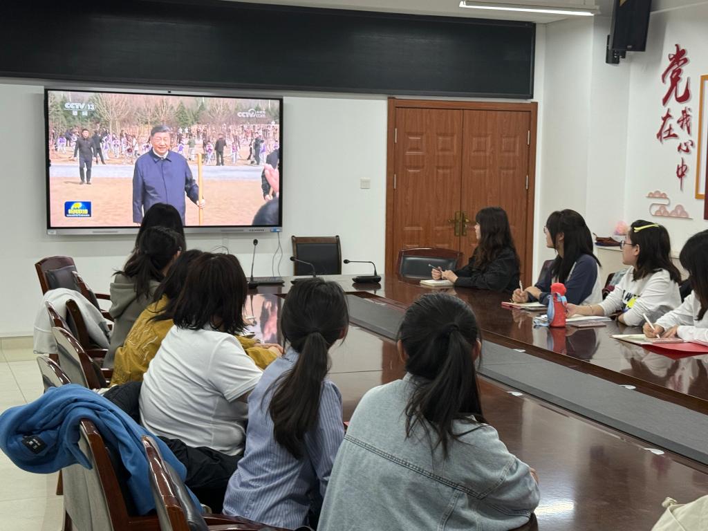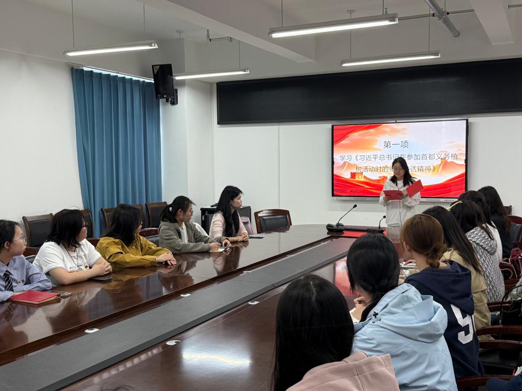 会议共有三项议程。第一项,由党员代表范欣莲带领全体党员学习《习近平总书记在参加首都义务植树活动时的重要讲话精神》。通过原文领学、要点解读,党员们深刻领会“绿色发展是高质量发展的底色”“植树造林是生态文明建设的重要举措”等核心要义,进一步增强了投身生态文明建设的政治自觉与行动自觉。第二项,全体党员集体观看视频《习近平参加首都植树活动》,直观感受习近平总书记以身作则参与生态实践的生动场景。视频中,习近平总书记与群众并肩植树的画面,让党员们深切体会到“绿水青山就是金山银山”的发展理念在实践中的生动诠释,进一步激发了践行绿色行动、守护生态家园的责任感。第三项,各党小组围绕“习近平总书记向绿而行,以绿赋能,我们该怎么做”展开热烈讨论。党员们结合小学教育专业特色,从“将绿色理念融入未来教育教学”“以师范生身份传播生态文明种子”“在日常学习生活中践行低碳行动”等角度畅所欲言,碰撞出“绿色教育赋能成长,师范先行引领风尚”的思想火花。