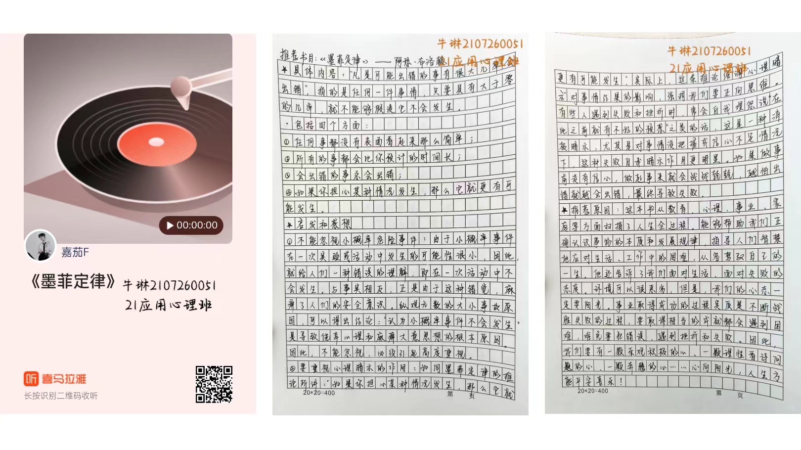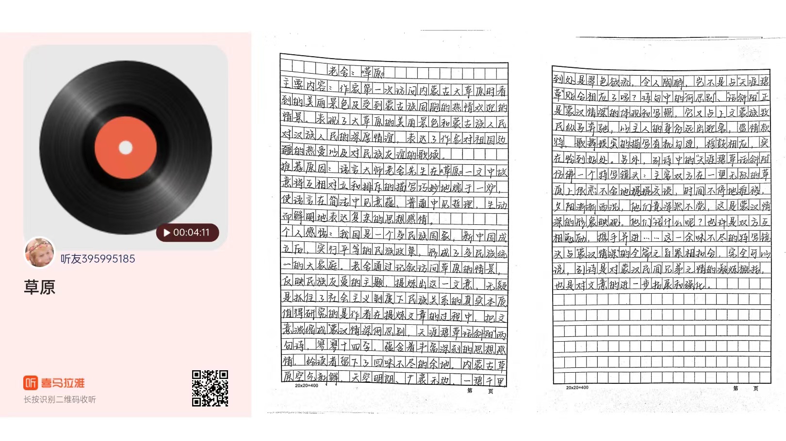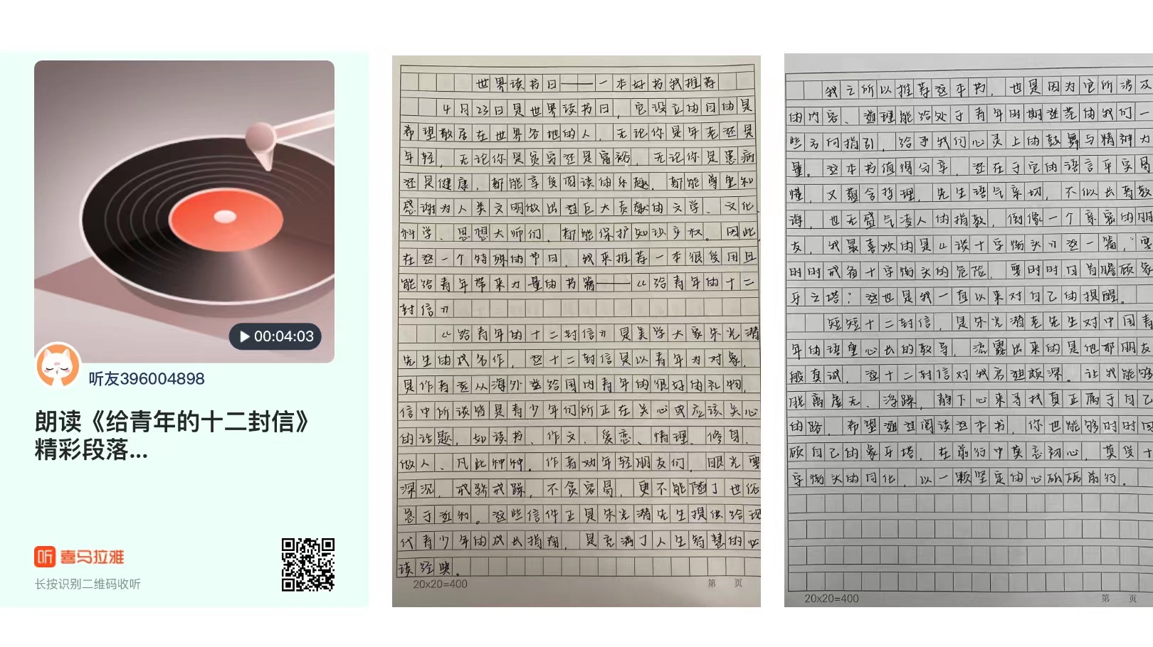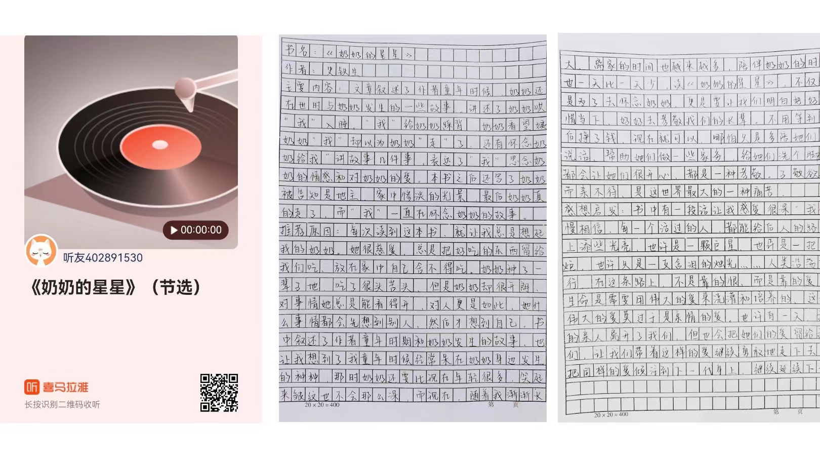 此次活动要求学生在喜马拉雅APP录制朗读经典书目片段,并书写推荐心仪书籍、介绍主要内容、分享心得感悟,同学们积极参与,共收到作品122份。大家的朗读绘声绘色,悦耳动听。有的同学朗读了富有童话色彩的《小王子》,带我们回到了充满童真与想象的B612星球,在感悟中引用《菩提偈》中的诗句“心是菩提树,身如明镜台。明镜本清净,何处染尘埃”,呼吁大家保持内心的澄澈透亮,初心不变;有的同学带我们走进沈从文的《边城》,感受湘西地区特有的风土人情;还有的同学推荐了老舍的《草原》,强调了作者最后引用“蒙汉情深何忍别,天涯碧草话斜阳”这句话,抒发了对草原的热爱之情和对蒙汉两族的深情厚谊。他们的朗读抑扬顿挫,富有情感,他们的感悟纸短意长,不尽欲言。