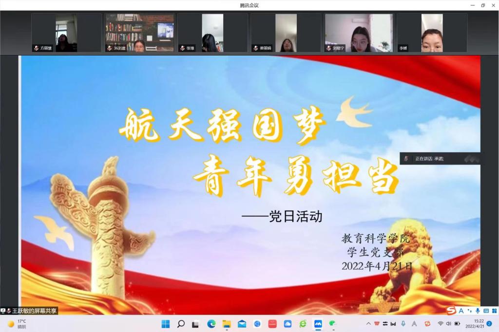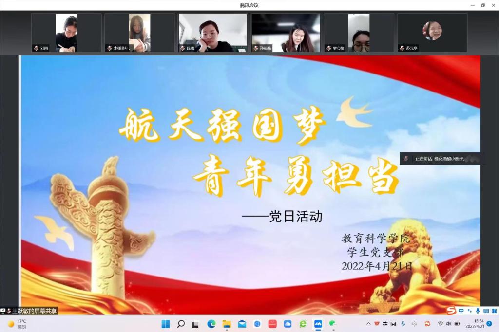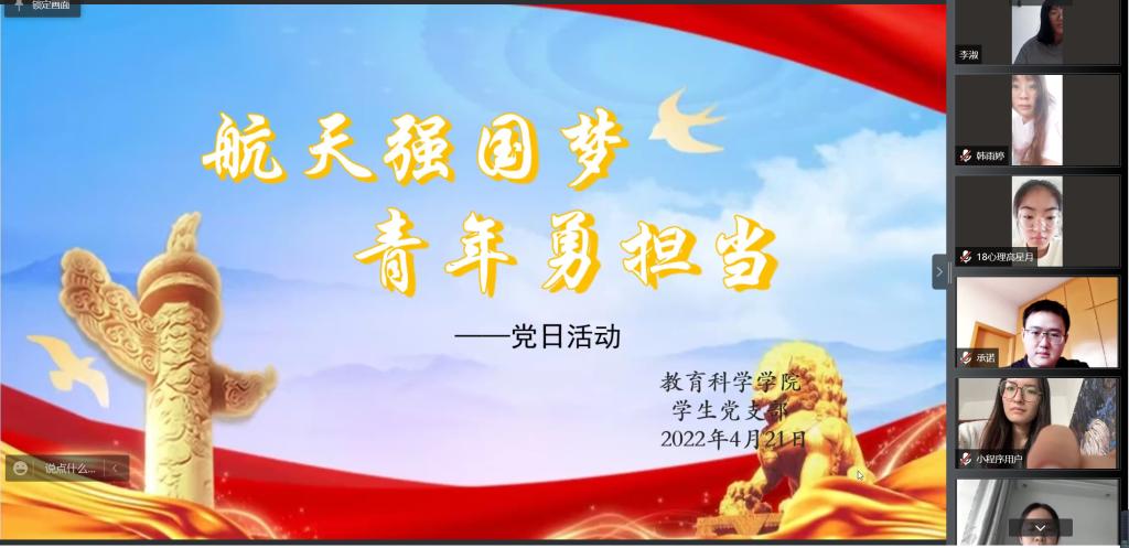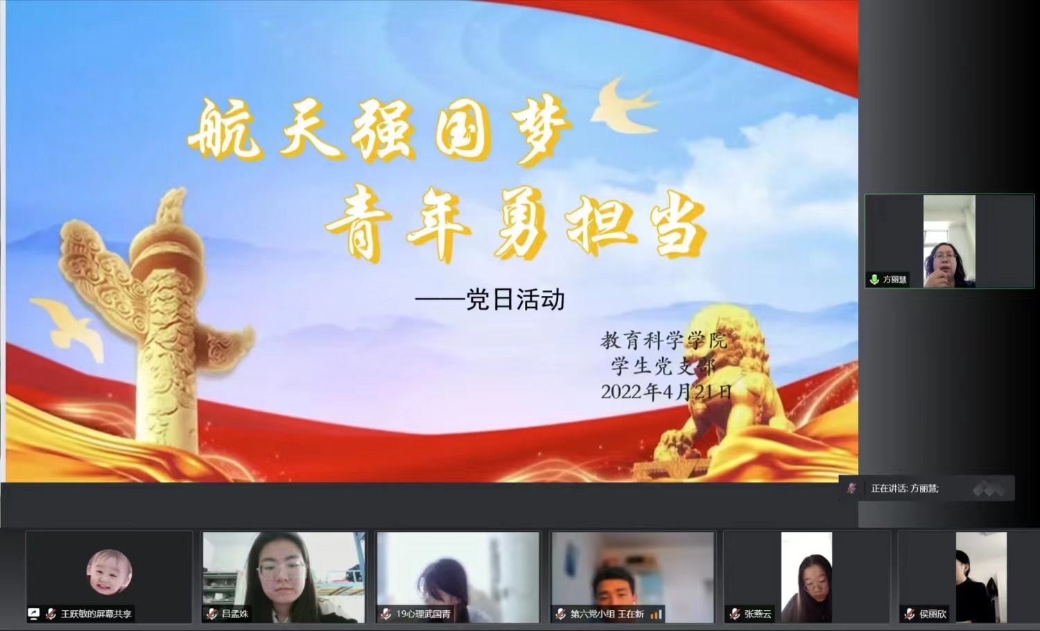 学生党支部于4月21日在腾讯会议上举办了“航天强国梦,青年勇担当”主题党日活动,该活动以演讲比赛形式开展,由学生第一支部副书记姜丽娟、学生第二支部书记方丽慧及三名学生干部担任评委。活动由两个支部共12名党小组代表参加,97名党员在线观看。学生党员们在演讲中表达了对神舟十三号航天员乘组飞行任务圆满成功,安全返航的热烈庆祝。同时,有的学生党员也分享了自己的感动瞬间,例如神舟十三号的中国航天研究人员夜以继日的努力,以及在这六个月的时光里,航天员们出色的完成了一个又一个的任务,首次出舱、再度出舱、太空跨年、天宫课堂......浩瀚太空见证了中国航天的硬核技术,也见证着专属于中国的独特浪漫,言语中充分表达了对伟大航天员的敬佩之情。党员们强调,作为新时代青年,要坚定理想信念,练就过硬本领,勇于创新创造,矢志艰苦奋斗,锤炼高尚品格,担民族复兴之重任。会议的最后,由方丽慧老师对本次活动进行点评,强调了活动虽然是在线上,但各位学生党员依然准备充分,鼓励各党员学习航天员的优秀品质,要立存高远,脚踏实地。