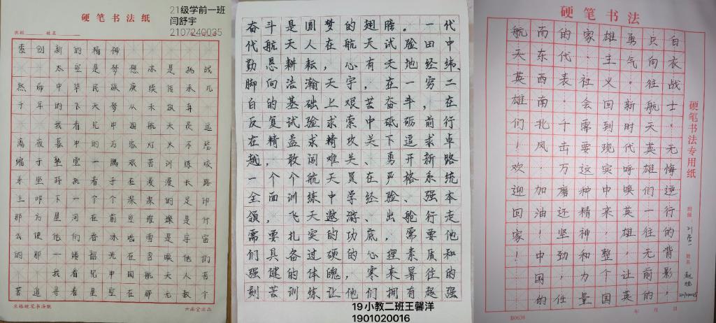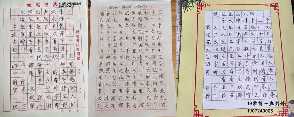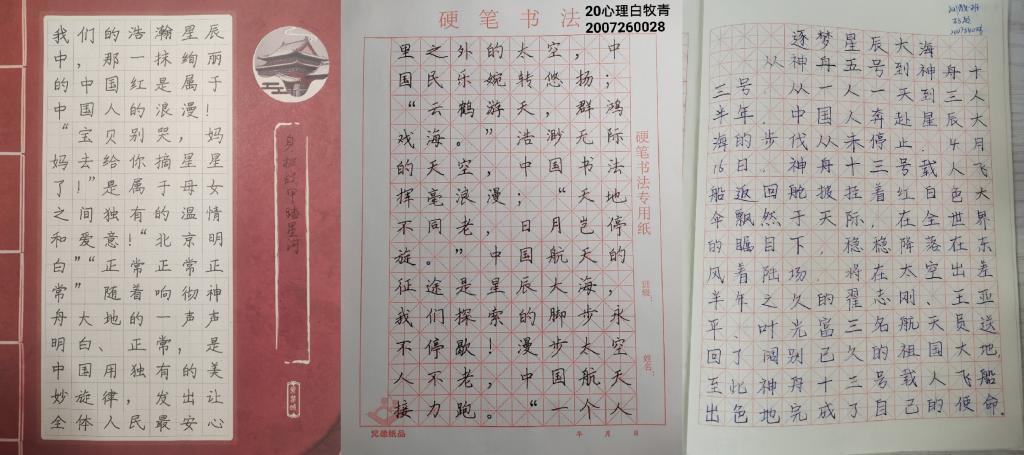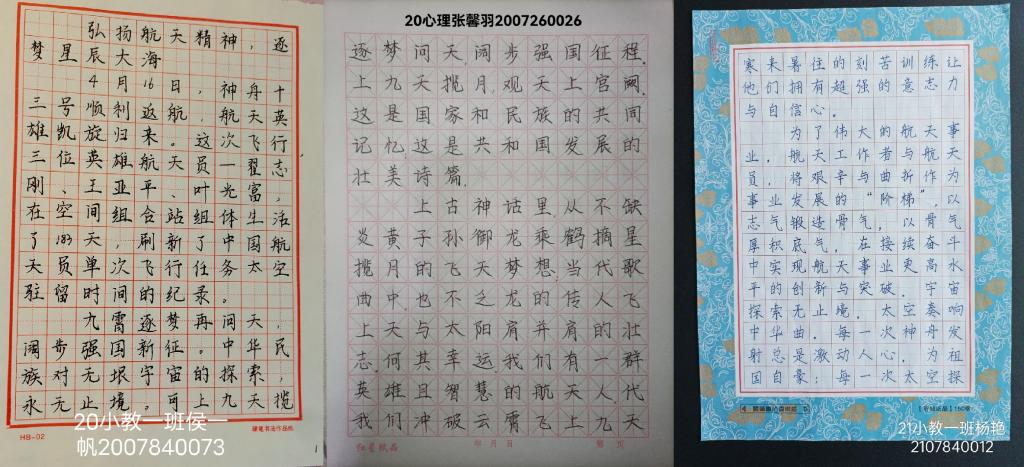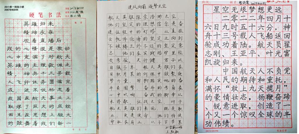 学生会权益保障部于4月16日至18日举办“弘扬航天精神,逐梦星辰大海”征文征集活动。本次活动要求同学们在观看神舟十三号返航直播后,以硬笔书法的方式表达自己的切身感悟。活动中,同学们以《英雄归来,精神永存》、《以航天之梦,筑中华伟业》等主题,阐述了中国航天与时俱进的航天实力,赞扬了中国航天工作者勤恳耕耘、追求卓越、勇开新路的航天精神,表达了作为一名中国人,为中国航天事业所取得的成就而感到骄傲自豪。作品中,同学们书写的每一个钢笔字都遒劲有力、刚健柔美,展现了中国航天不怕困难、迎难而上、愈战愈勇的无畏精神。