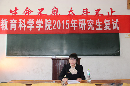 2015年3月26——27日,教育科学学院组织了小学教育专业硕士学位研究生复试工作。为了保证复试工作的顺利进行,学院专门成立了复试工作领导小组,组长由郝红英院长担任,小组成员有科技处周智慧副处长、教育科学学院李芳教授、刘慧贤教授、胡利军副教授、颉瑛琦。